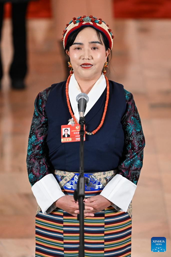 Mikyi Tsomo, a member of the 14th National Committee of the Chinese People's Political Consultative Conference (CPPCC), attends a group interview ahead of the second plenary meeting of the fourth session of the 14th CPPCC National Committee at the Great Hall of the People in Beijing, capital of China, March 7, 2026. (Xinhua/Cao Yiming)