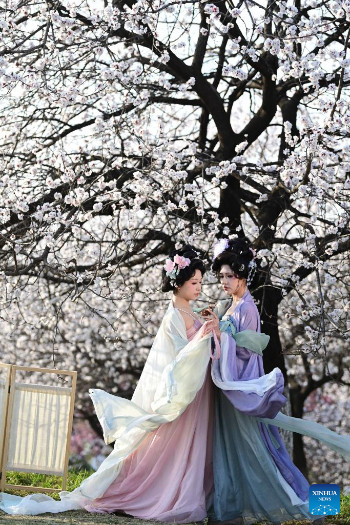 A tourist poses for photos with blooming trees at the Daming Palace National Heritage Park, in Xi'an, northwest China's Shaanxi Province, March 9, 2026. Flowers bloom as temperature rises in China. (Xinhua/Zou Jingyi)