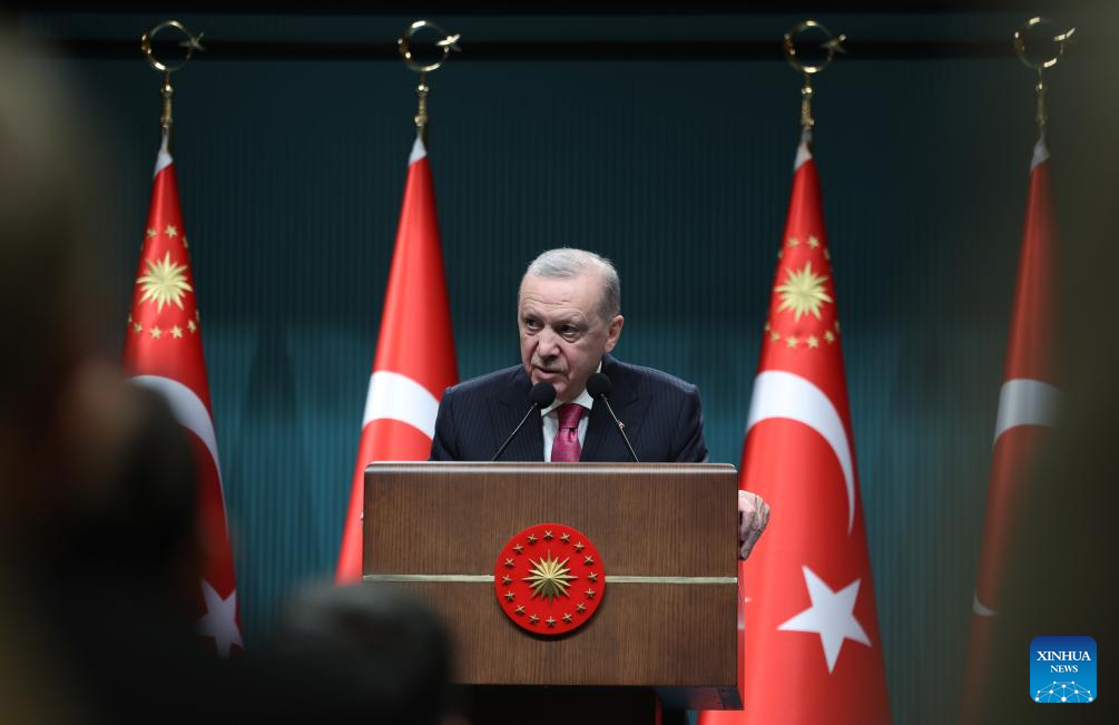 Turkish President Recep Tayyip Erdogan speaks at a press conference following a cabinet meeting in Ankara, Trkiye, on March 9, 2026. Erdogan said on Monday that Trkiye is maintaining a high level of vigilance amid escalating regional tensions, warning that "provocative steps" could strain Ankara's relations with Tehran. (Mustafa Kaya/Handout via Xinhua)