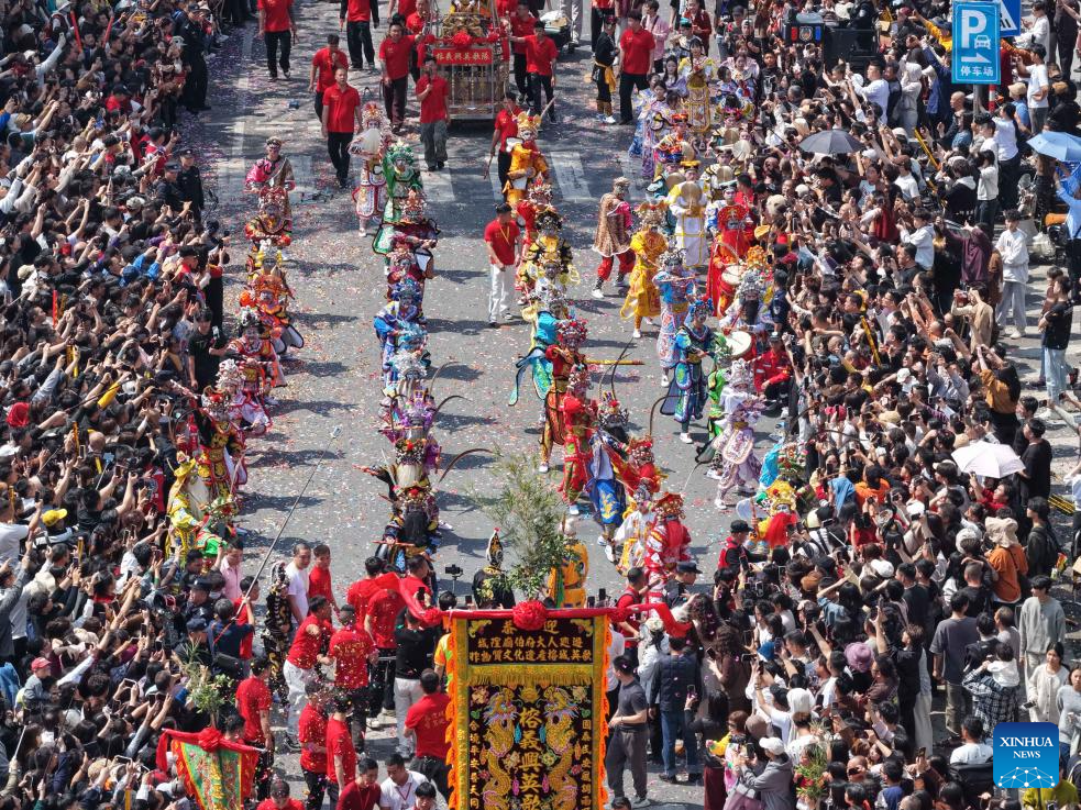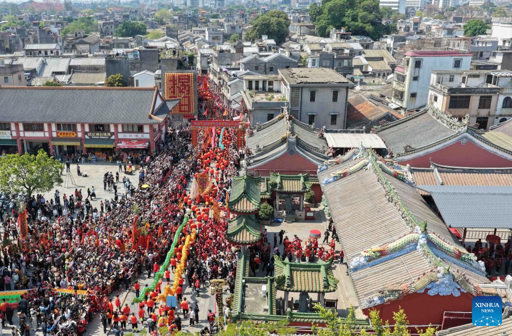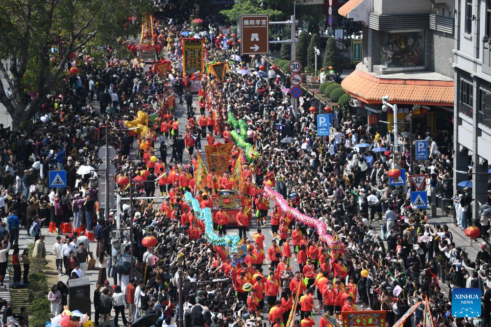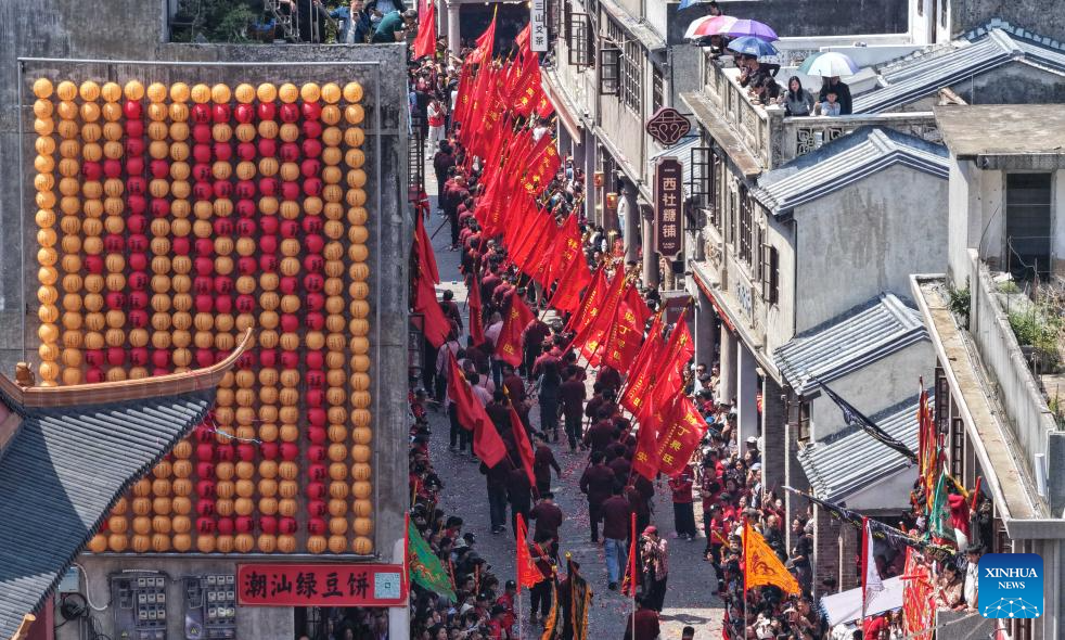 This aerial drone photo taken on March 11, 2026 shows a parade during the Chenghuang temple fair in Jieyang, south China's Guangdong Province. The Chenghuang temple fair, held on the 23rd day of the first month on the traditional Chinese calendar, is one of the major traditional folk cultural events in Jieyang. (Xinhua/Deng Hua)