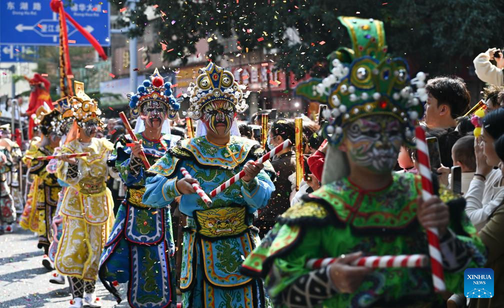 Parade performers interact with the audience during the Chenghuang temple fair in Jieyang, south China's Guangdong Province, March 11, 2026. The Chenghuang temple fair, held on the 23rd day of the first month on the traditional Chinese calendar, is one of the major traditional folk cultural events in Jieyang. (Photo by Huang Guangping/Xinhua)