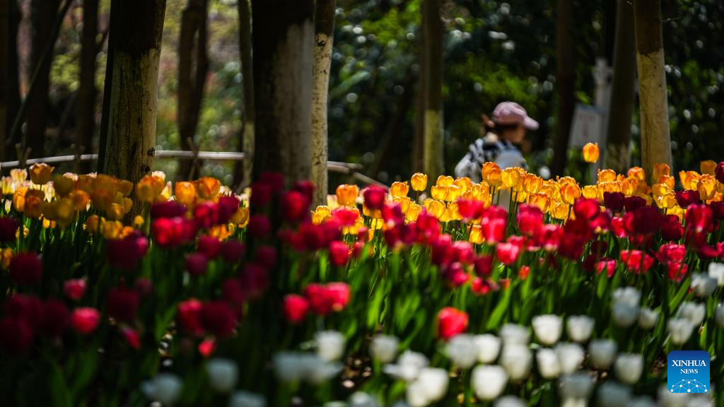 A tourist views tulips at Longjiashan National Forest Park in Longli County, southwest China's Guizhou Province, March 12, 2026. (Xinhua/Tao Liang)