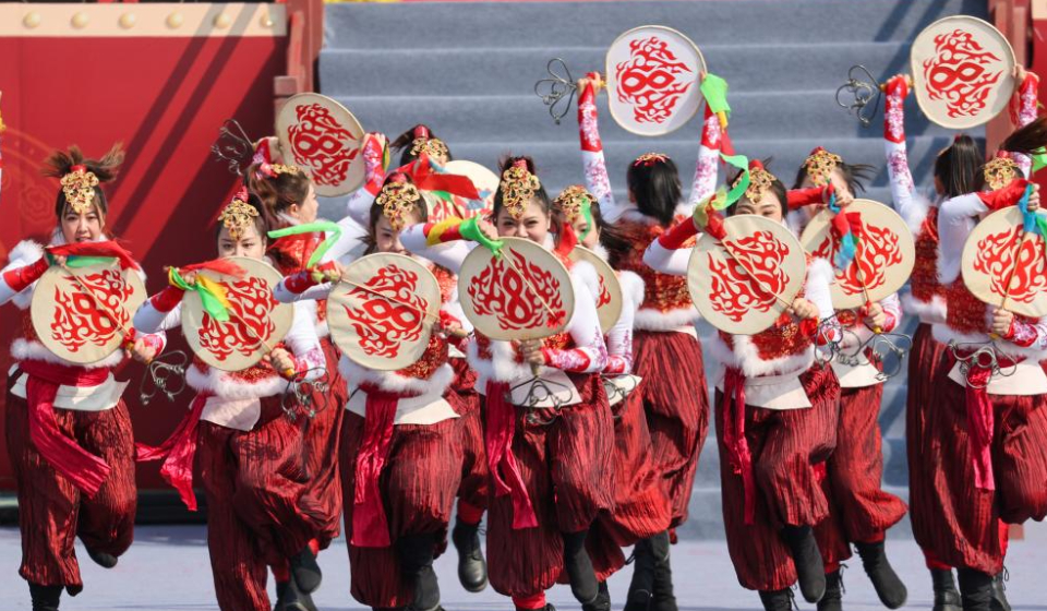 Artists perform during a drum contest at Zhengding ancient city in Shijiazhuang, north China's Hebei Province, March 15, 2026. A national drum contest was held here on Sunday, which was attended by 14 drum teams from across the country. (Photo by Zhang Xiaofeng/Xinhua)