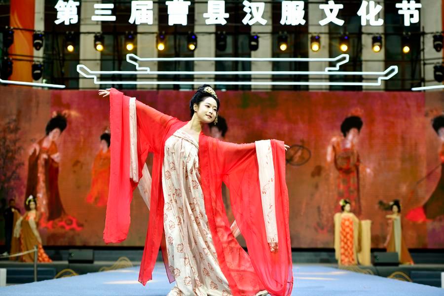 A model presents Hanfu on the stage during a Hanfu launch event in Caoxian County of Heze City, east China's Shandong Province, April 10, 2025. (Xinhua/Guo Xulei)