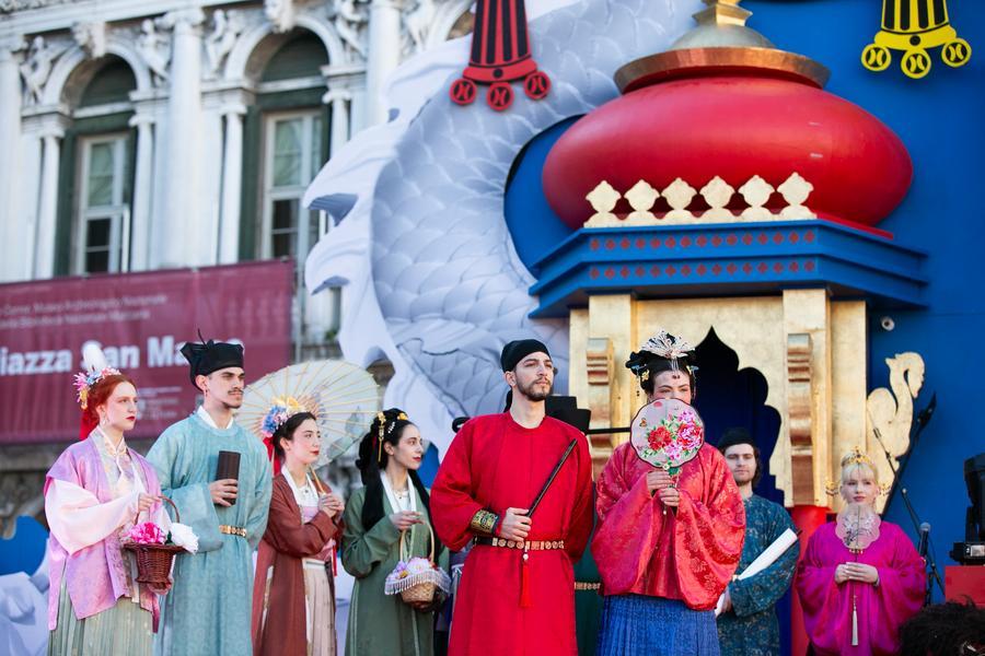 Italian volunteers display Hanfu, a style of clothing traditionally worn by the Han people, at Piazza San Marco in Venice, Italy, Feb. 13, 2024. (Xinhua/Li Jing)