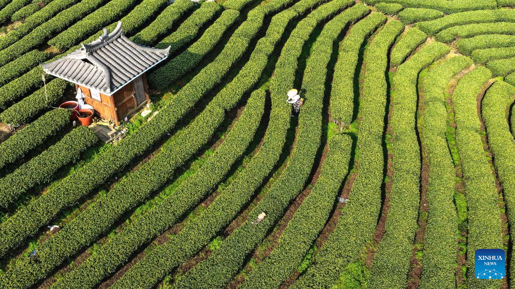 An aerial drone photo taken on March 13, 2026 shows a farmer picking tea leaves in a tea garden in Sanjiang Dong Autonomous County, south China's Guangxi Zhuang Autonomous Region. As the spring tea picking season starts, tea factories and farmers are busy harvesting tea leaves in Sanjiang Dong Autonomous County. (Xinhua/Zhang Ailin)