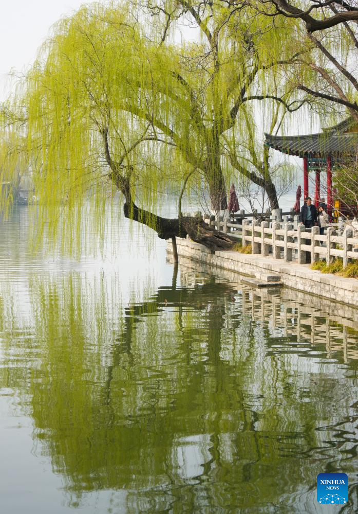 People visit the Daming Lake in Jinan, east China's Shandong Province, March 17, 2026. Willow trees around the Daming Lake have turned green as temperature rises, attracting tourists for sightseeing. (Xinhua/Xu Suhui)