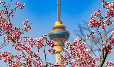 Photo taken on March 16, 2026 shows early cherry blossoms in full bloom at Yuyuantan Park in Beijing, filling the air with fragrance and forming a picturesque scene alongside the Central Radio and TV Tower. (Liu Xianguo/Guangming Picture)