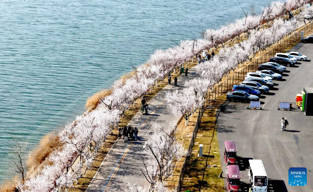 An aerial drone photo taken on March 16, 2026 shows tourists viewing flowers by the Hutuo River in Shijiazhuang, north China's Hebei Province. (Photo by Chen Qibao/Xinhua)
