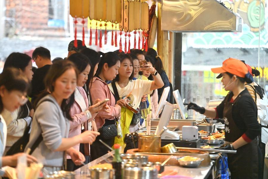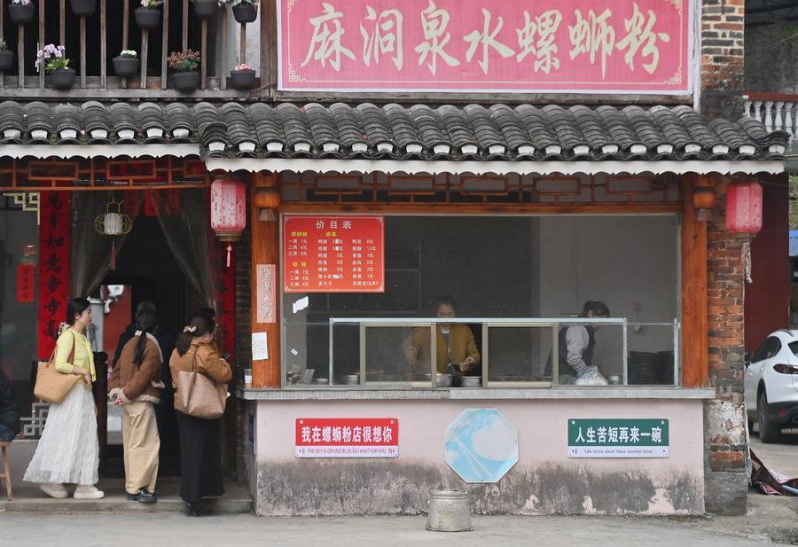 Tourists queue up to buy Luosifen from a shop at Xinguo Village of Rongshui Miao Autonomous County, south China's Guangxi Zhuang Autonomous Region, March 7, 2026. (Xinhua/Huang Xiaobang)