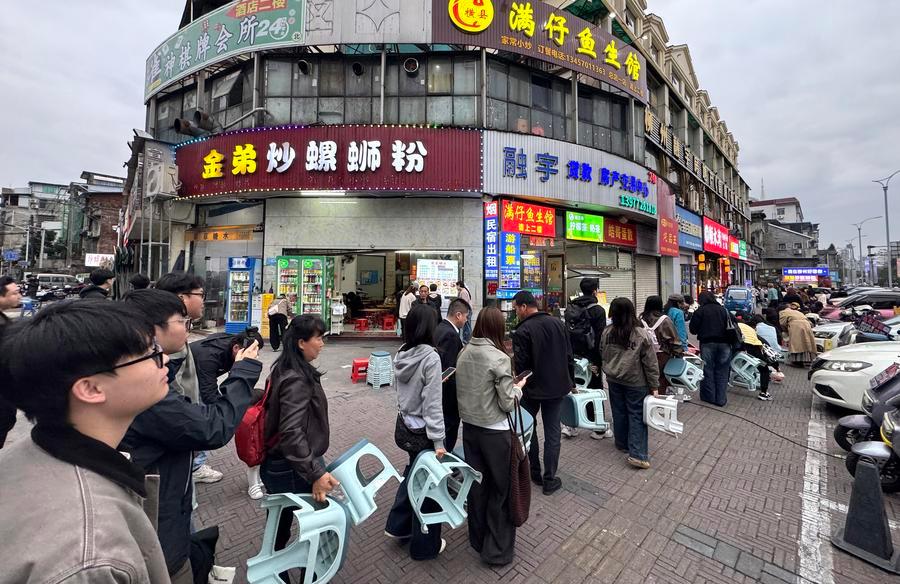 People queue up to buy stir-fried Luosifen from a shop in Liuzhou City, south China's Guangxi Zhuang Autonomous Region, March 10, 2026. (Photo by Zheng Changhao/Xinhua)