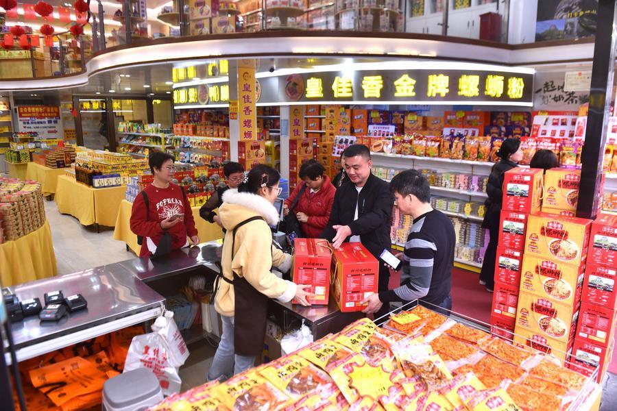 Tourists buy Luosifen at a specialty shop in Liuzhou City, south China's Guangxi Zhuang Autonomous Region, March 10, 2026. (Xinhua/Huang Xiaobang)