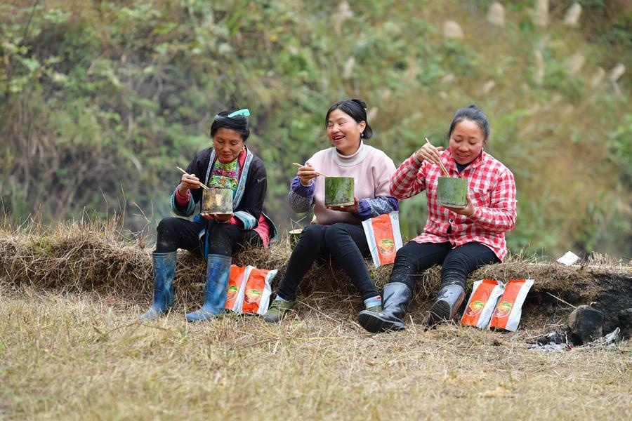 Farmers eat Luosifen in the fields at Dangjiu Village of Rongshui Miao Autonomous County, south China's Guangxi Zhuang Autonomous Region, Dec. 10, 2021. (Xinhua/Huang Xiaobang)