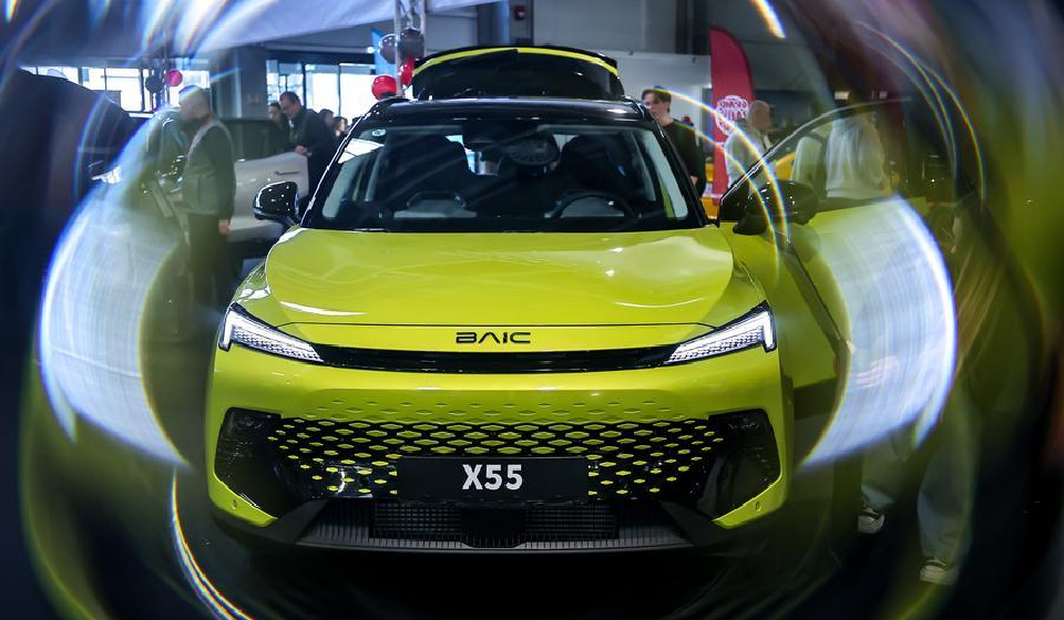 This photo taken on March 13, 2026 shows a car at a booth of Chinese car maker BAIC during the International Automobile and Tuning Show in Budapest, Hungary. (Photo by David Balog/Xinhua)
