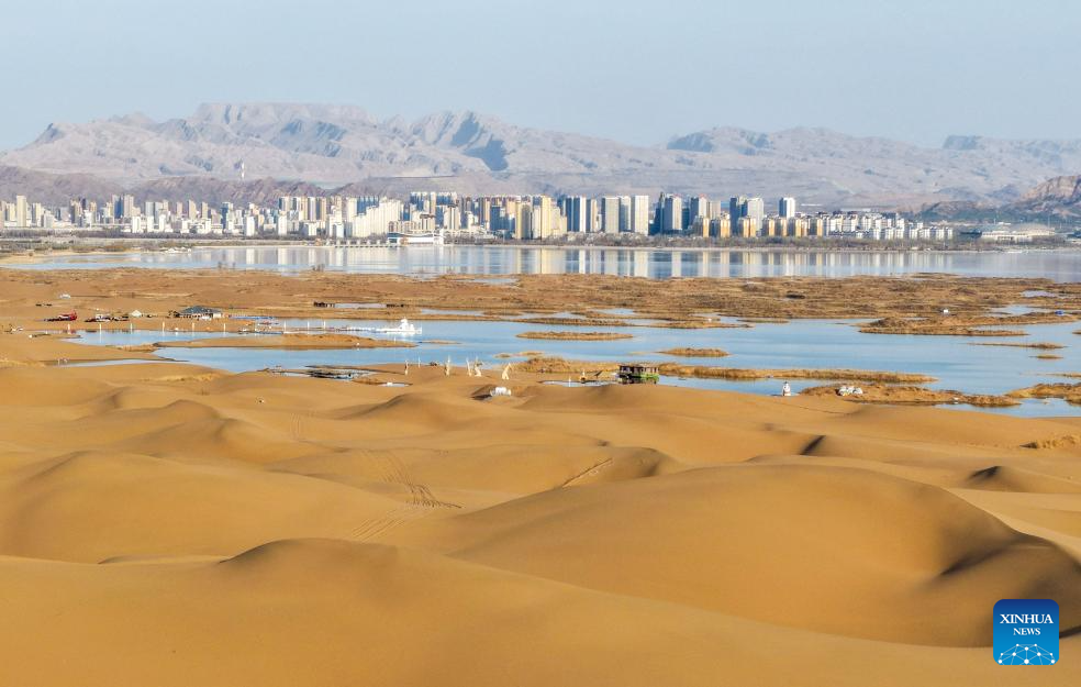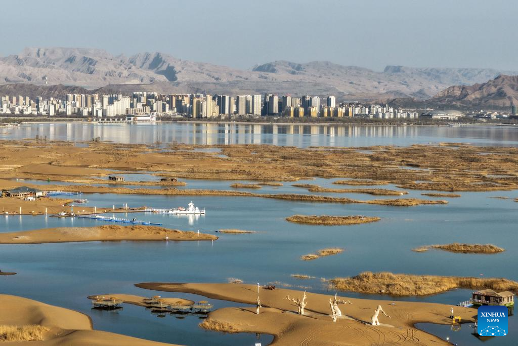 An aerial drone photo taken on March 25, 2026 shows a view of Wuhai Lake in Wuhai City, north China's Inner Mongolia Autonomous Region.