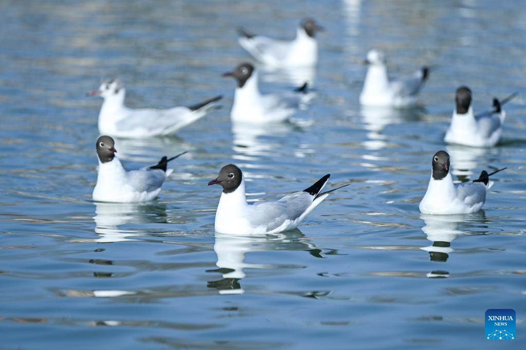 Black-headed gulls are pictured in Wuhai Lake in Wuhai City, north China's Inner Mongolia Autonomous Region, March 25, 2026.