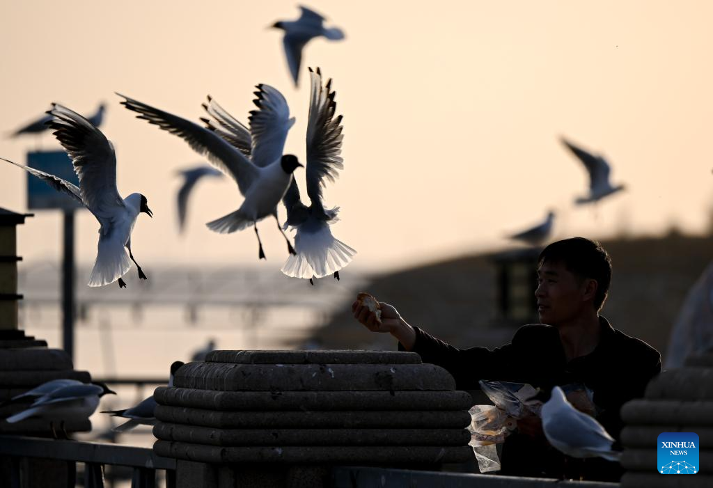 A tourist feeds black-headed gulls by Wuhai Lake in Wuhai City, north China's Inner Mongolia Autonomous Region, March 25, 2026.