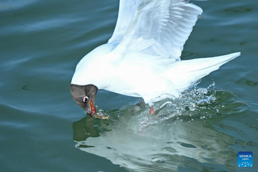 A black-headed gull forages in Wuhai Lake in Wuhai City, north China's Inner Mongolia Autonomous Region, March 25, 2026.