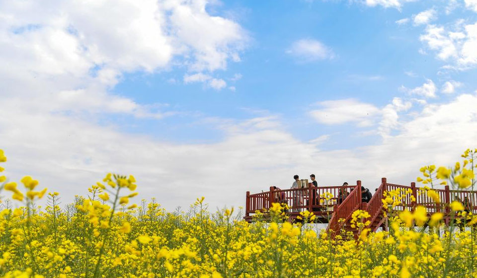 People visit a scenic spot in Huangtang Village, Hanzhong City of northwest China's Shaanxi Province, March 27, 2026. As rapeseed flowers bloom across Hanzhong, the city has launched 15 flower-themed sightseeing routes for visitors, integrating local cuisine, camping, intangible cultural heritage performances and art study tours into tourism, boosting the development of local "flower economy". (Xinhua/Zou Jingyi)