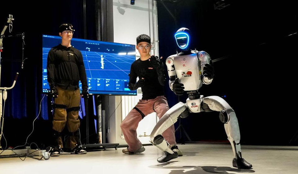 Staff of Noitom Technology Co., Ltd. demonstrate a collaborative robot controlled through motion capture technology during the International Sci-Fi and Future Tech Expo Beijing 2026 in Beijing, capital of China, March 26, 2026. At the 2026 Zhongguancun Forum, which opened on March 25, a large number of advanced intelligent robots attracted attention. At an embodied intelligence innovation industrial park in Zhongguancun, Haidian, reporters gained insight into the core technologies underpinning the agile performance of robots.