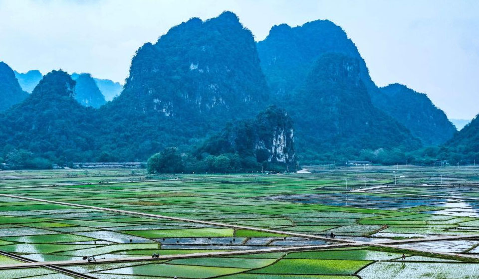 A drone photo taken on March 29, 2026 shows farmers working in fields in Matang Village of Xingye County, Yulin City in south China's Guangxi Zhuang Autonomous Region. (Photo by Liu Zheng/Xinhua)