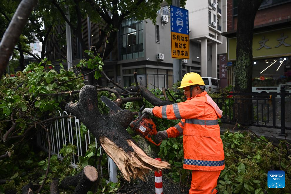 A staff member clears fallen trees from a road in Guangzhou, south China's Guangdong Province, March 30, 2026.