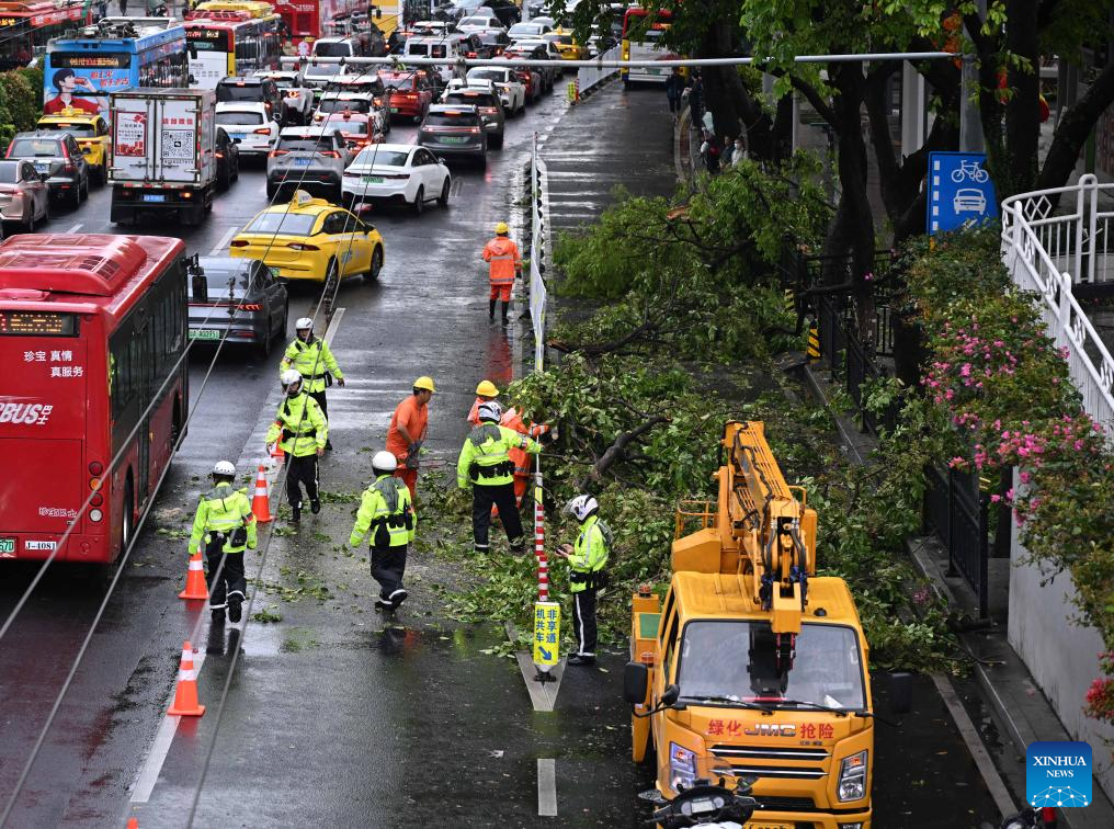 Staff members clear fallen trees from a road in Guangzhou, south China's Guangdong Province, March 30, 2026.
