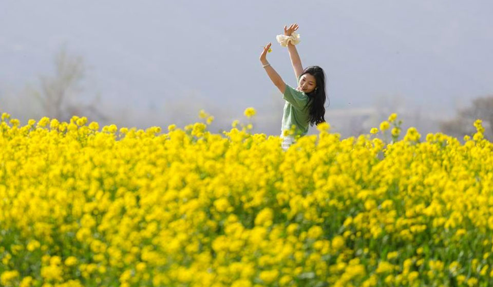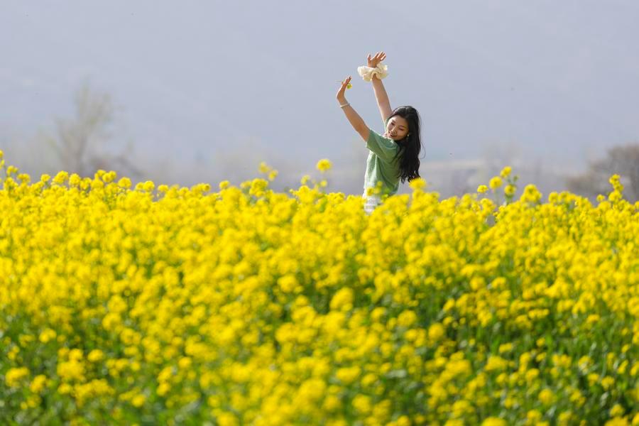 A tourist poses for photos in a rapeseed flower field in Xiyao Village of Yuncheng, north China's Shanxi Province, on March 20, 2026. (Xinhua/Yang Chenguang)