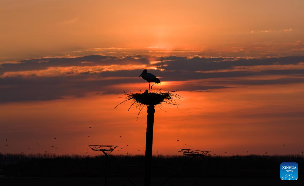 An aerial drone photo taken on April 1, 2026 shows an oriental white stork resting in a nest in Zhaodong, northeast China's Heilongjiang Province. (Photo by Liu Dapeng/Xinhua)