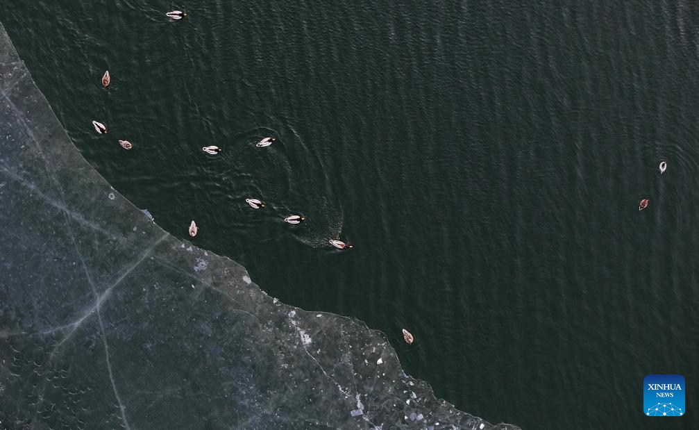 An aerial drone photo taken on March 30, 2026 shows migratory birds resting on the Harbin section of Songhua River in northeast China's Heilongjiang Province. (Photo by Zhang Shu/Xinhua)