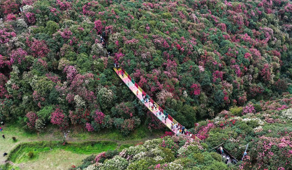 An aerial drone photo shows tourists visiting an azalea scenic area in Bijie City, southwest China's Guizhou Province, April 1, 2026. The azaleas in Bijie are currently in full bloom, drawing crowds of visitors. (Xinhua/Yang Wenbin)