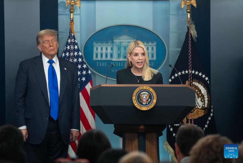 U.S. President Donald Trump said Thursday on social media that Attorney General Pam Bondi will step down from her position and Deputy Attorney General Todd Blanche will serve as acting attorney general. This file photo taken on June 27, 2025 shows Pam Bondi speaking during a press conference at the White House in Washington, D.C., the United States. (Xinhua/Hu Yousong)
