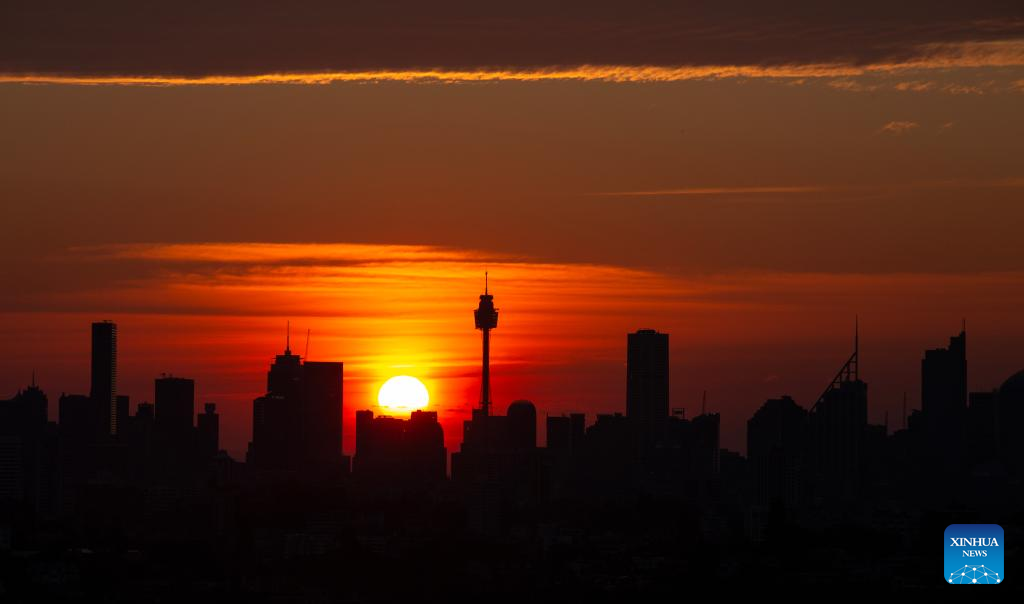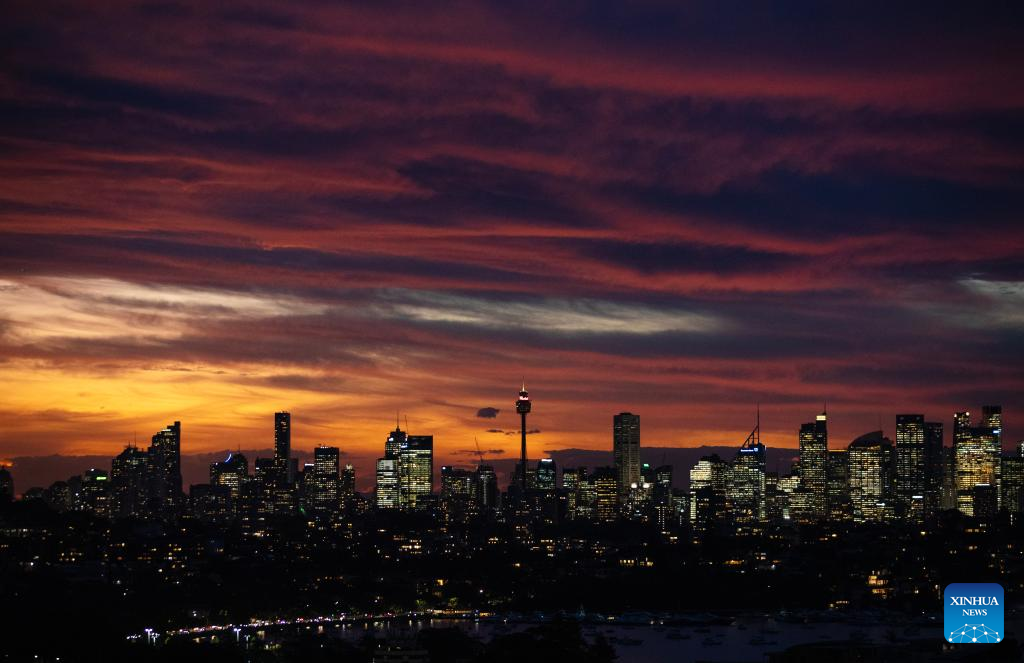 This photo taken on Sept. 25, 2025 shows a view of the skyline at sunset in Sydney, Australia. (Xinhua/Ma Ping)