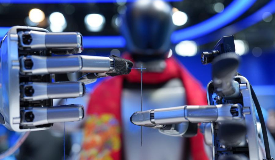 A robot shows its function of needle threading at the permanent exhibition at the Zhongguancun Exhibition Center in Beijing, capital of China, March 25, 2026. (Xinhua/Ju Huanzong)