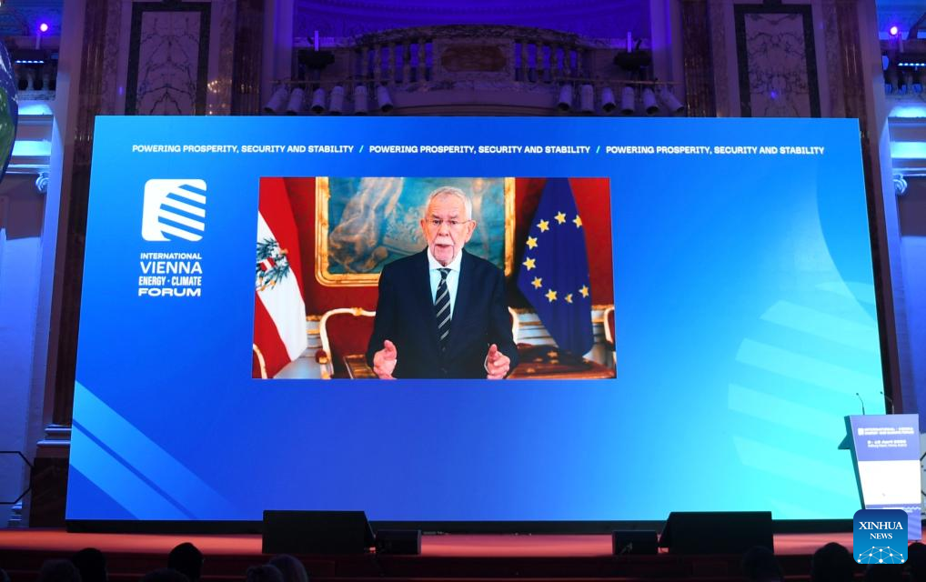 Austrian President Alexander Van der Bellen delivers a video speech at the International Vienna Energy and Climate Forum in Vienna, Austria, April 9, 2026. Under the theme "Powering Prosperity, Security and Stability," the International Vienna Energy and Climate Forum 2026 opened here on Thursday. (Xinhua/He Canling)