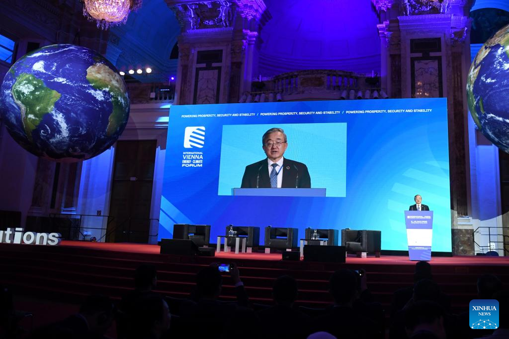 This photo taken on April 9, 2026 shows a view at the International Vienna Energy and Climate Forum in Vienna, Austria. Under the theme "Powering Prosperity, Security and Stability," the International Vienna Energy and Climate Forum 2026 opened here on Thursday. (Xinhua/He Canling)