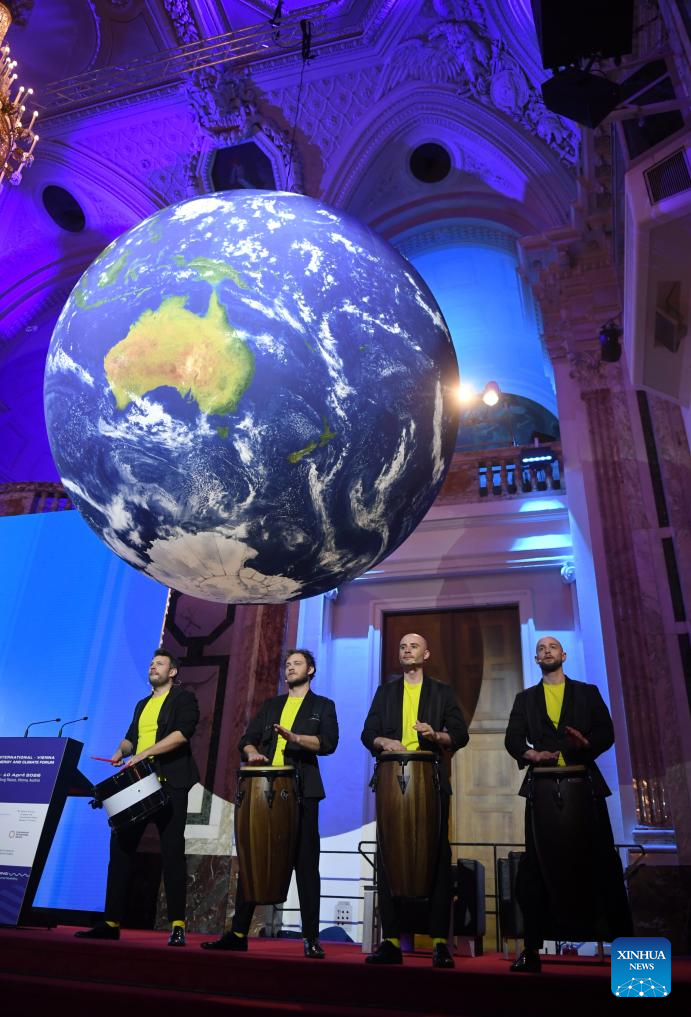 This photo taken on April 9, 2026 shows an art performance at the International Vienna Energy and Climate Forum in Vienna, Austria. Under the theme "Powering Prosperity, Security and Stability," the International Vienna Energy and Climate Forum 2026 opened here on Thursday. (Xinhua/He Canling)
