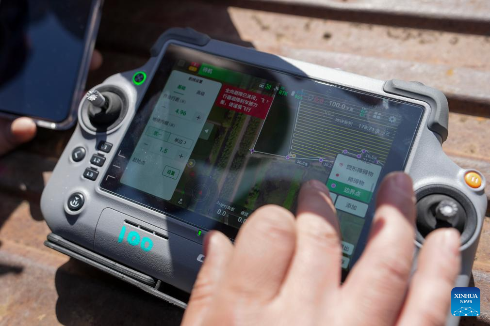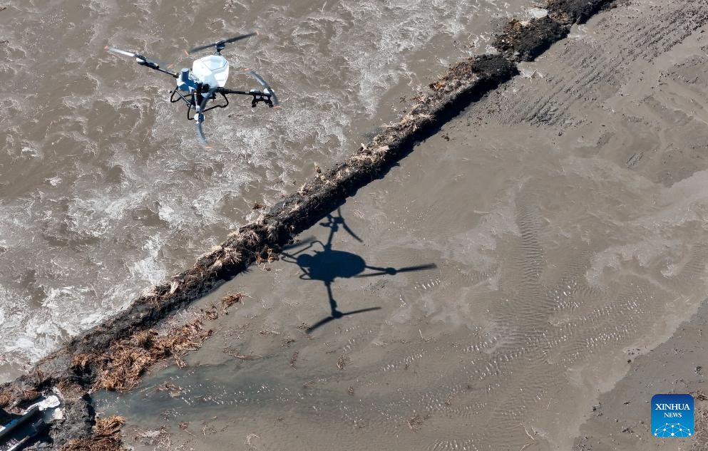 A farmer operates an agricultural drone to spray fertilizer onto paddy fields of Youyi Farm Co., Ltd. under Beidahuang Group in Shuangyashan, northeast China's Heilongjiang Province, April 9, 2026. Heilongjiang, a major grain-producing area in China, has entered the spring ploughing season for rice. (Xinhua/Wang Song)