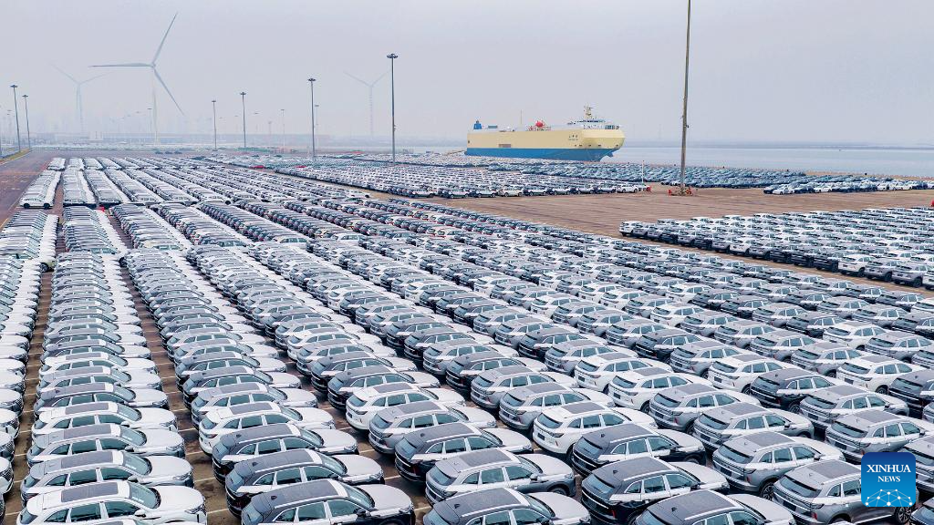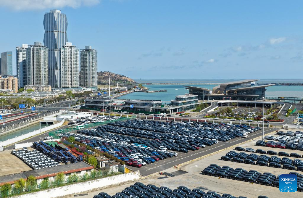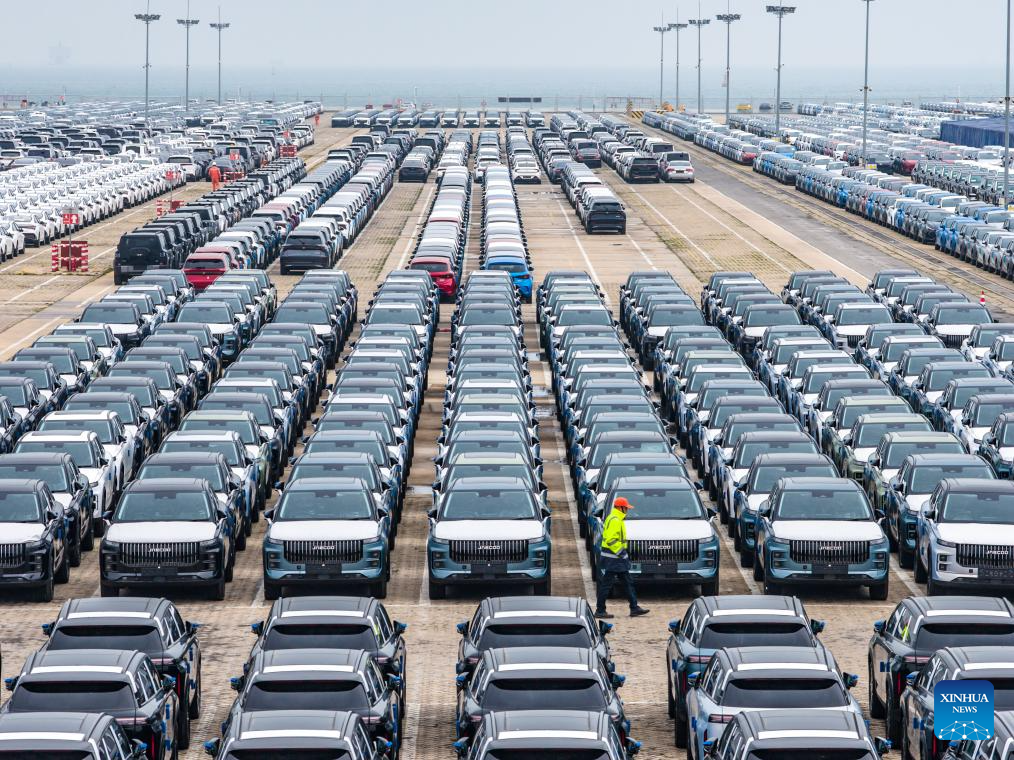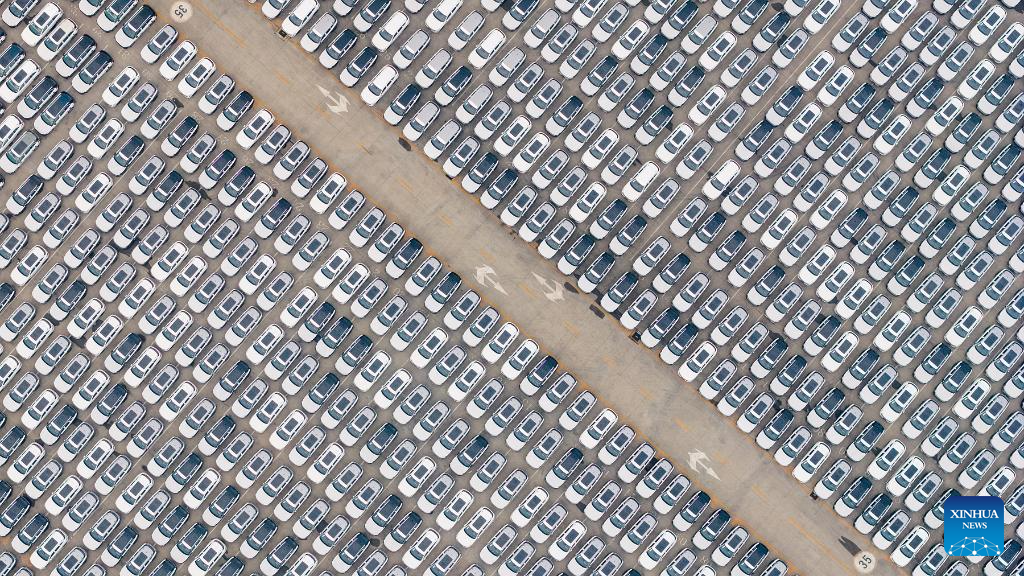 An aerial drone photo taken on April 10, 2026 shows vehicles to be exported at a ro-ro dock of Tianjin Port in north China's Tianjin. China's automobile production and sales rose sharply in March from the previous month, industry data showed on Friday. Automobile output totaled 2.92 million units in March and sales came in at 2.9 million units, surging 74.4 percent and 60.6 percent month on month, respectively, according to the China Association of Automobile Manufacturers. New energy vehicle (NEV) output and sales stood at 1.23 million units and 1.25 million units, respectively. (Photo by Du Penghui/Xinhua)