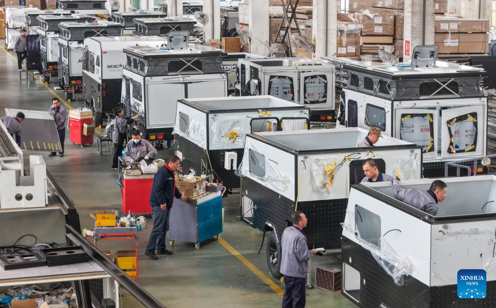 Workers assemble new energy recreational vehicles (RVs) at a RV manufacturing industrial base in an economic development zone in Rongcheng, east China's Shandong Province, April 10, 2026.
