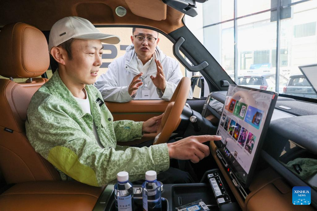 A man experiences a new energy vehicle at a car dealership in Tengzhou City, east China's Shandong Province, April 10, 2026.