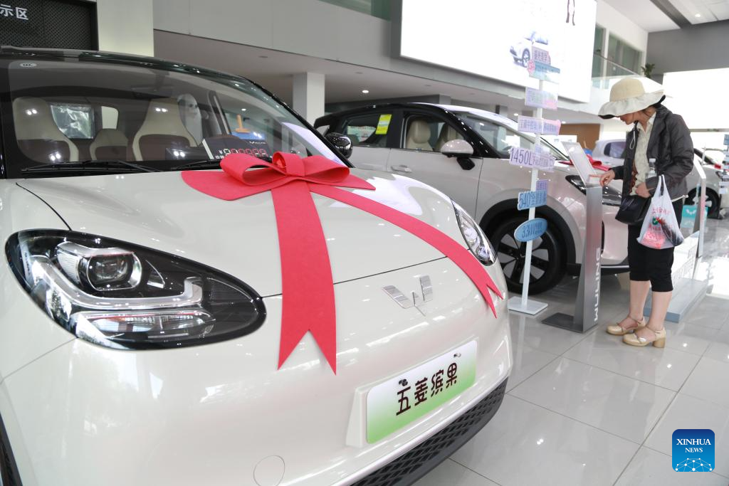 A woman learns about a new energy vehicle at a car dealership in Mengzi City, southwest China's Yunnan Province, April 10, 2026.