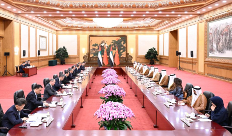 Chinese Premier Li Qiang holds talks with Sheikh Khaled bin Mohamed bin Zayed Al Nahyan, Crown Prince of Abu Dhabi, United Arab Emirates (UAE), at the Great Hall of the People in Beijing, capital of China, April 13, 2026. (Xinhua/Huang Jingwen)
