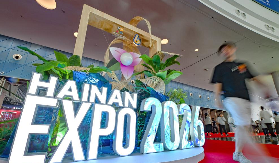 A man walks past a display sign of the sixth China International Consumer Products Expo (CICPE) in Haikou, south China's Hainan Province, April 13, 2026. Jointly hosted by China's Ministry of Commerce and the Hainan provincial government, the sixth CICPE marks the first edition of the event since the Hainan Free Trade Port fully launched island-wide special customs operations.