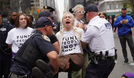 People are detained during a protest against war and U.S. Immigration and Customs Enforcement (ICE), and supporting Palestine in New York, the United States, on April 13, 2026. (Xinhua/Zhang Fengguo)