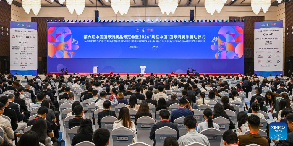 This photo taken on April 13, 2026 shows a scene at the launch event for the sixth China International Consumer Products Expo and 2026 "Shopping in China" International Consumption Season, in Haikou, south China's Hainan Province. The sixth CICPE is scheduled to take place in Hainan from April 13 to 18. (Xinhua/Yang Guanyu)