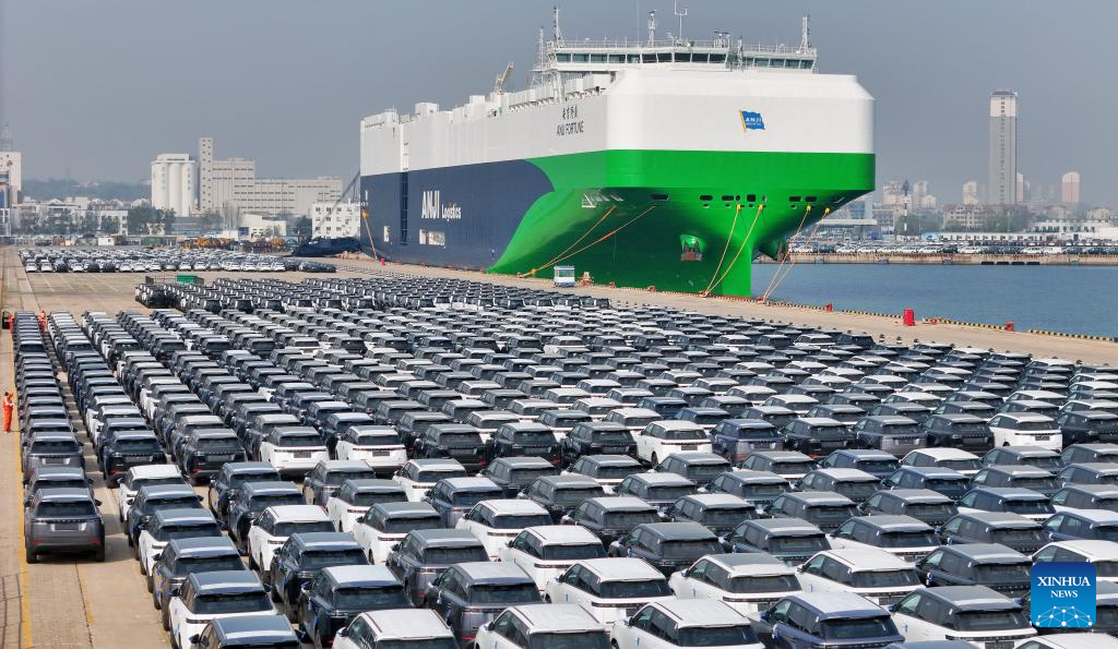 A drone photo taken on April 14, 2026 shows vehicles to be exported at Yantai Port in east China's Shandong Province. China's foreign trade grew 15 percent year on year in the first quarter (Q1) of 2026, data from the General Administration of Customs showed on Tuesday.