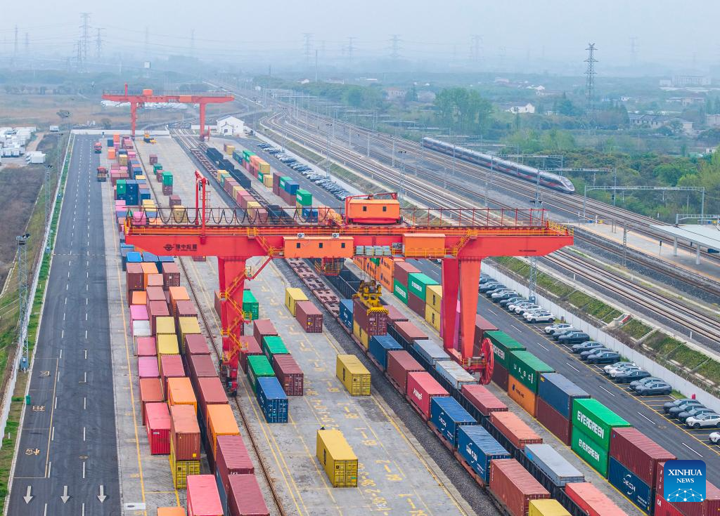A drone photo taken on April 14, 2026 shows a container being hoisted onto a rail-sea intermodal freight train at a logistics base of Nanjing railway logistics center in Yangzhou, east China's Jiangsu Province. China's foreign trade grew 15 percent year on year in the first quarter (Q1) of 2026, data from the General Administration of Customs showed on Tuesday.