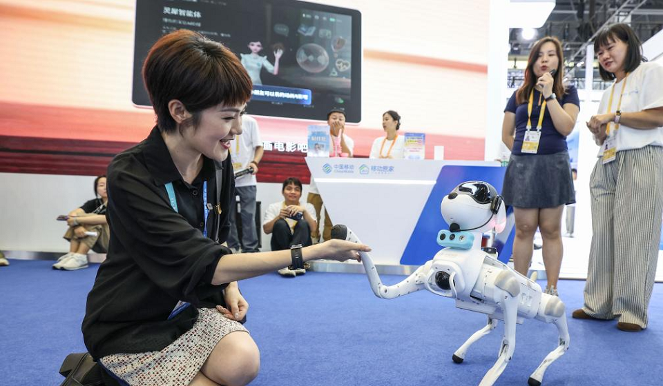 A visitor interacts with a robot dog during the sixth China International Consumer Products Expo (CICPE) in Haikou, south China's Hainan Province, April 13, 2026. The ongoing sixth CICPE features groundbreaking innovations in artificial intelligence (AI). A wide range of new tech consumer products are showcased at the event, spanning multiple sectors including smart interaction, wearable devices, and smart healthcare. (Xinhua/Zhang Liyun)
