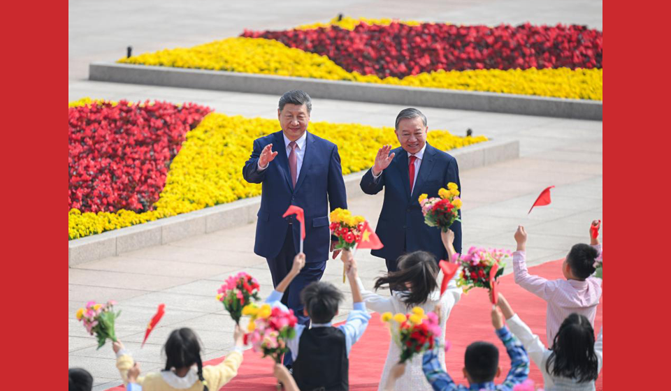 General Secretary of the Communist Party of China Central Committee and Chinese President Xi Jinping holds a welcome ceremony for General Secretary of the Communist Party of Vietnam Central Committee and Vietnamese President To Lam at the square outside the east gate of the Great Hall of the People prior to their talks in Beijing, capital of China, April 15, 2026. Xi held talks with To Lam, who is on a state visit to China, in Beijing on Wednesday. (Xinhua/Li Xiang)